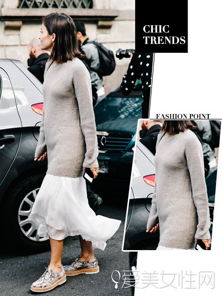 灰色长款毛衣配上仙仙的白色雪纺裙十分飘逸,动物纹的牛津鞋增添英伦风!