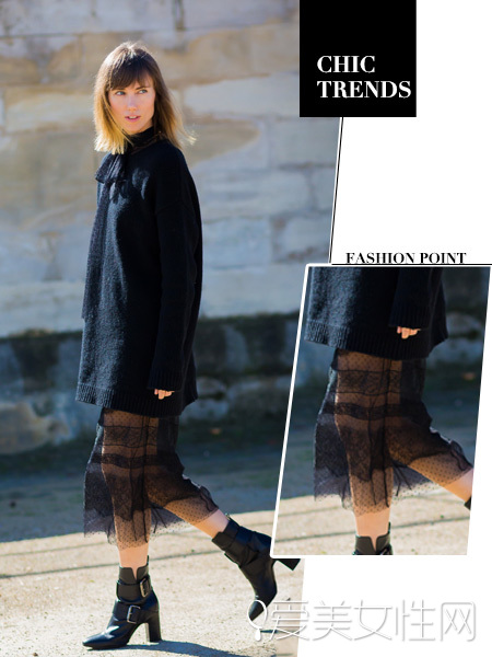 黑色长款毛衣配上黑色纱裙,相当优雅,名媛味十足!粗跟短靴使造型饱满,毛衣的领口设计非常淑女。