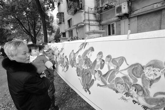 楚天金报讯 昨日下午,在青山区钢都123社区里,20米长的“百猴图”吸引了许多居民观赏。画家江先孝、江舟父子历时一年,创作了这幅图,画中共有168只猴子,寓意在春节来临之际祝福大家“一路发”。多年来,江先孝已创作了十二幅生肖画作,他计划今年以十二幅《生肖百图》申请吉尼斯纪录。