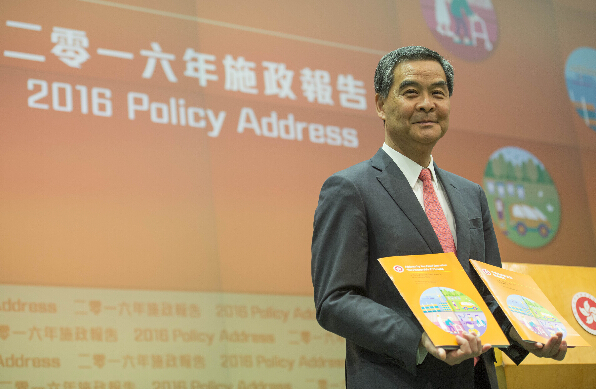 梁振英13日立法会发表2016年施政报告,以“创新经济、改善民生、促进和谐、繁荣共享”为主题。新华社