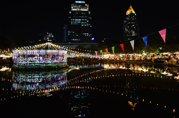 在泰國曼谷隆批尼公園,旅游節上的夜市燈火通明。