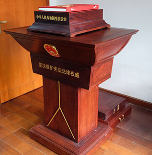 记者现场看到,中华人民共和国宪法宣誓规范法器全套共五件,分别由宪法宣誓领誓法台(集体宣誓领誓人专用)、宪法宣誓法台、宪法宣誓领誓法台脚踏——“上台”(两件)、中华人民共和国宪法(书法版宣誓专用)图书共同构成,全套法器全部选用红木材质加工,采用中国传统的榫卯结构制作,设计独特新颖、外观庄重大方。