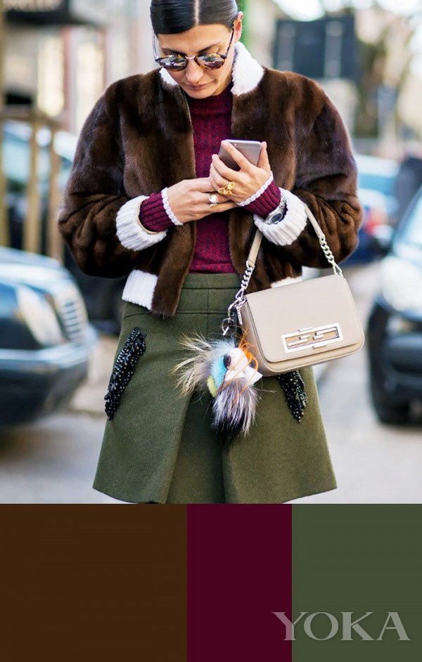 这组搭配其实和第一组十分相似,但是整体却柔和了许多,尤其是2015年度流行色玛萨拉红和同样大热门的橄榄绿,组合到一起意外的知性温柔。