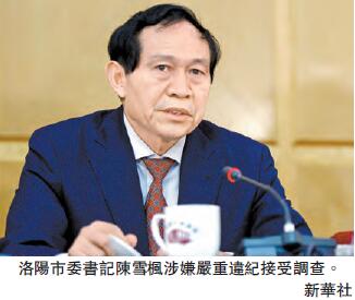 據中央紀委監察部網站昨日消息,河南省委常委、洛陽市委書記陳雪楓涉嫌嚴重違紀,目前正接受組織調查。