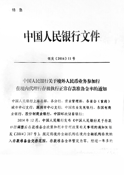 昨日,人行發出《中國人民銀行關於境外人民幣業務參加行在境內代理行存放執行正常存款準備金率的通知》(銀發【2016】11號),據網傳圖片顯示該通知級別為「特急」。早在2014年12月,中國人民銀行發布《中國人民銀行關於存款口徑調整後存款準備金政策和利率管理政策有關事項的通知》(銀發【2014】387號),規定將境外金融機構在境內金融機構存放納入存款準備金交付範圍,存款準備金率暫定為零。新文件表明,387號文在實行一年後即將壽終正寢。