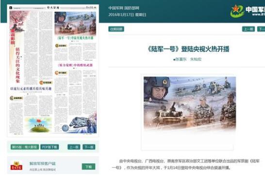 這篇題為《<陸軍一號>登陸央視火熱開播》的報道稱,“由中央電視臺、廣西電視臺、原南京軍區政治部文工團等單位聯合出品的軍旅劇《陸軍一號》,作為央視的開年大戲,于1月14日登陸中央電視臺綜合頻道開播……劇中大部分演員出自原南京軍區前線文工團。”