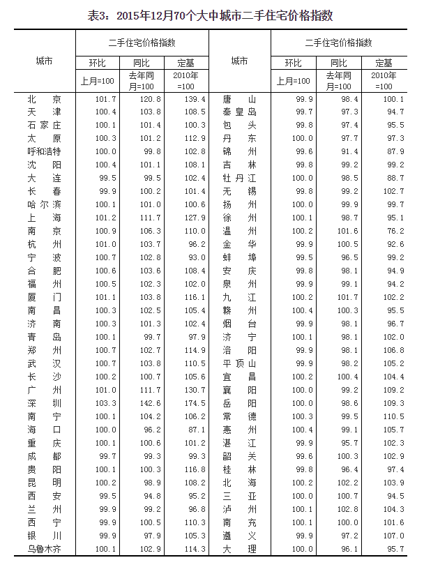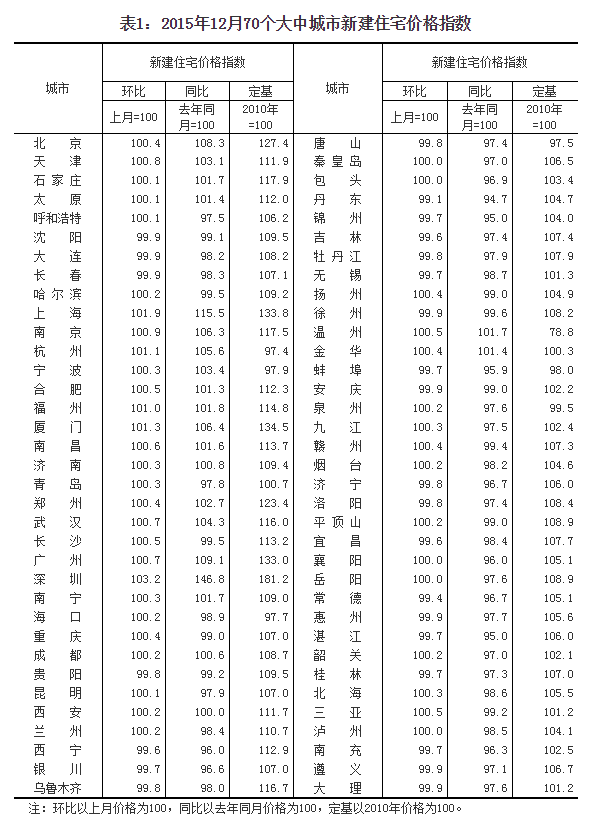 新華網消息 國家統計局1月18日公布的數據顯示,2015年12月份,全國70個大中城市新建商品住宅和二手住宅價格延續上月走勢,環比繼續小幅上漲。