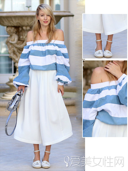 【搭配示范】:白色一字肩蕾丝上衣+长裤+短靴。