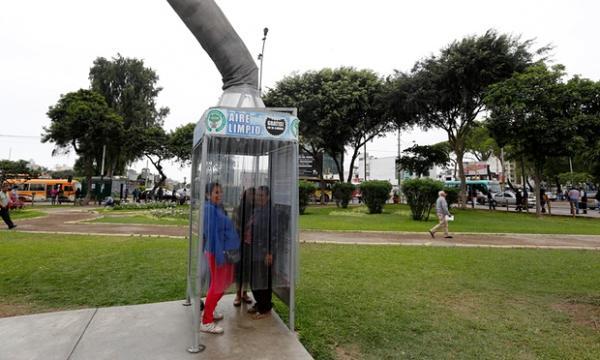 人们在秘鲁首都利马的一个巨大空气净化器中呼吸新鲜空气。
