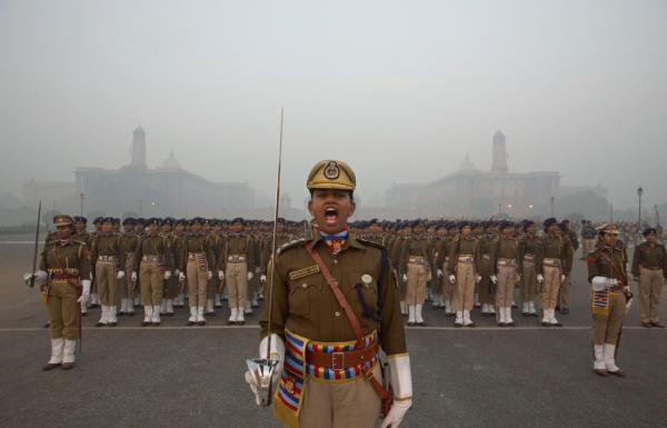 当地时间2016年1月5日,印度新德里,印度士兵冒着严重雾霾参加将于26日举行的共和国日大阅兵彩排。 东方IC 资料