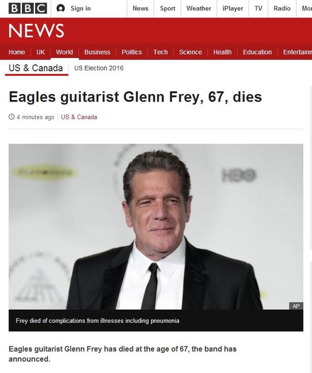 据英国广播公司BBC1月19日报道,著名美国摇滚乐队“老鹰乐队”的主唱之一的格列·弗雷(Glenn Frey)于当地时间1月18日在纽约去世,享年67岁。