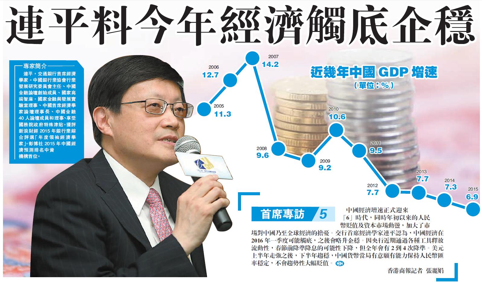 中國經濟增速正式迎來「6」時代,同時年初以來的人民幣貶值及資本市場動盪,加大了市場對中國乃至全球經濟的擔憂。交行首席經濟學家連平認為,中國經濟在2016年一季度可能觸底,之后會略升企穩。因央行近期通過各種工具釋放流動性,春節前降準降息的可能性下降,但全年會有2到4次降準。美元上半年走強之后,下半年趨穩,中國貨幣當局有意願有能力保持人民幣匯率穩定,不會趨勢性大幅貶值。香港商報記者 張麗娟