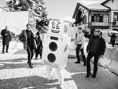 1月21日,達沃斯論壇會議中心入口處,有人扮成了機器人的模樣,寓意“第四次工業革命”的主題。