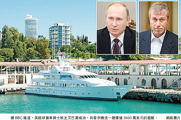 俄羅斯現代商船公司前負責人斯卡格稱,他親眼目睹了一艘3500萬美元(約2.7億港元)的游艇轉到普京名下。斯卡格稱,那艘57米長的「奧林匹亞」號游艇是生活在英國的著名俄羅斯巨富、車路士班主艾巴莫域治送給普京的禮物。