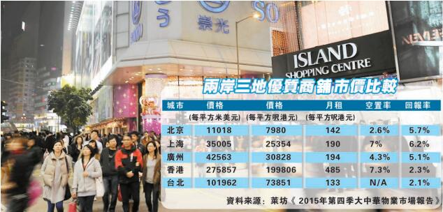 【香港商報网訊】記者韓濠昕報道:物業顧問公司萊坊昨日發表《2015年第四季的大中華物業市場報告》,探討北京、上海、廣州、香港和臺北的優質商舖、甲級寫字樓及豪宅物業市場。盡管受進出口放緩、股市震蕩及美國加息等內外經濟因素困擾,去年第四季度大中華區主要城市房地產市場表現大致保持平穩。展望2016年,本港零售寒冬預料將持續,加上本港商舖空置率較高,優質商舖租金將進一步下調。