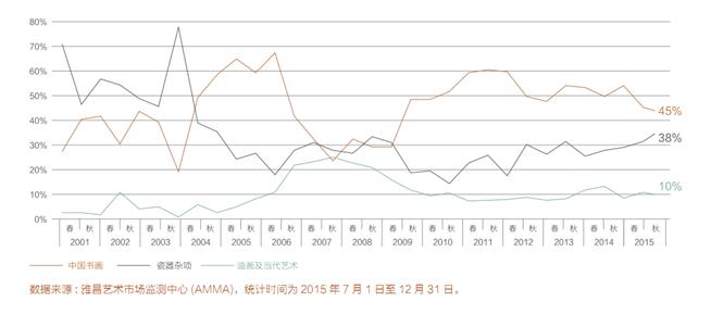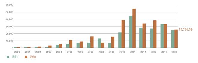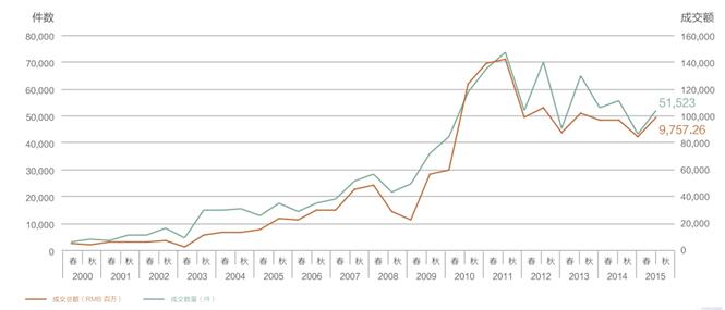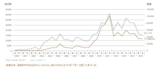数据来源:雅昌艺术市场监测中心(AMMA),统计时间为2015年7月1日至12月31日。 下降19.1% 2015年秋拍中国艺术品市场延续了春拍的疲软态势。据AMMA不完全统计,本季度拍卖总额为257亿元,同比下降19.1%;上拍量,同比减少23.8%。专场数量、上拍数量等大幅缩减,这也是拍卖公司在市场运行压力大、征集困难的现实情况下不得不做出的应对策略。而更小规模的拍卖公司则选择在2015年中只举办一次拍卖会或取消拍卖。即使如此,这部分拍卖公司在2015年中的表现也不甚理想。 2000年春拍-2015年秋拍三大艺术品类成交额占比图 数据来源:雅昌艺术市场监测中心(AMMA),统计时间为2015年7月1日至12月31日。 萎缩18.9% 2015年秋拍,中国艺术品三大重要板块的市场成交总额反映了中国艺术品市场在进入“调整期”的节奏后,将呈现更多元化的发展。2015年秋,中国书画、瓷器杂项、油画及当代艺术三大板块总成交额为239.99亿元人民币,同比萎缩18.9%。其中仅有瓷杂板块成交额有所上涨。从历史数据可查瓷杂板块从2013年秋拍开始,已经连续4个拍卖季上涨。 2000 年春拍-2015 年秋拍,中国书画市场行情走势图 数据来源:雅昌艺术市场监测中心(AMMA),统计时间为2015年7月1日至12月31日。 下滑31.78% 2015年秋拍中国书画板块再遭重创,主导地位进一步被弱化。据AMMA不完全统计,2015年秋拍中国书画板块市场份额由2014年秋拍的53.44%下滑至45.07%。据AMMA不完全统计,2015年秋拍中国书画上拍11.61万件,成交46,118件,成交额同比2014年秋下滑31.78%,为115.96亿元。由此可见,目前艺术品拍卖处于低迷阶段,平均价位和市场需求都比较萎靡,减量提质的调整是必须的。在拍品难出高价、藏家不愿出手的情况下,拍卖行对拍品的投放热情也必然会降低。 2000年春拍-2015年秋拍瓷器杂项成交数量、成交总额变化图 数据来源:雅昌艺术市场监测中心(AMMA),统计时间为2015年7月1日至12月31日。 上涨1.6亿元 2015年秋拍瓷杂板块共上拍125,097件,成交51,523件,成交率为41.19%,同比下降了0.29个百分点,与2014年秋拍基本持平,上拍量同比下降了8%,成交量同比下降了6.95%。但是我们能够发现,2015年秋拍瓷杂板块总成交额为97.57亿元人民币,同比却上涨了1.6亿人民币,涨幅达到2%。从以上的数据中不难发现,2015年中国艺术品秋拍虽然形势严峻,但是各个拍卖行对于拍品的征集和选择却变得更加的挑剔,这种挑剔一方面来源于当今藏家群体对于拍品选择专业性方面的提升,另一方面也是由于这几年的瓷杂板块乃至整个中国艺术品拍卖市场去除泡沫化的成效显现。 ……亿元? ……%? 同比……? 环比……? 2015年的中国经济对艺术品市场有何影响?什么样的艺术品买了能赚钱?投资哪个艺术品板块能得到最大的回报?书画板块各价位区间的成交数据、国内瓷器收藏市场的风向、油画及当代艺术市场的涨跌幅度以及市场专家龚继遂先生的专业解读等等精彩内容,在报告中都将呈现。雅昌艺术市场监测中心(AMMA)用数据说话,为政府相关部门、拍卖公司、基金公司、一级市场、个人投资者、以及收藏爱好者提供多维度的专业分析,庞大的信息量难以言尽,欲知详情,请关注雅昌艺术市场监测中心(AMMA)官网(http://amma.artron.net/report.php)。