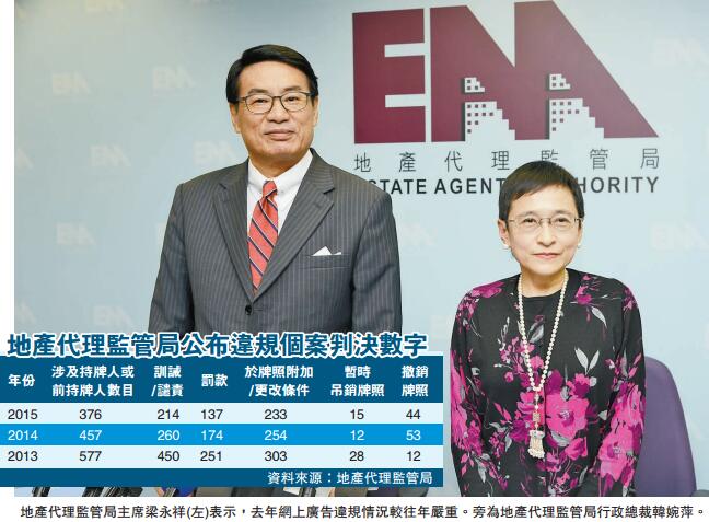 在2015年工作回顧方面,梁永祥指出,局方去年共處理400多宗投訴,當中155宗指稱成立。局方主動調查的則有70宗,指稱成立有39宗。他強調,去年個案中值得留意的,是網上廣告違規情況較往年嚴重,投訴由2014的5宗,大幅升到14宗,主要涉及發布失實或誤導廣告等。