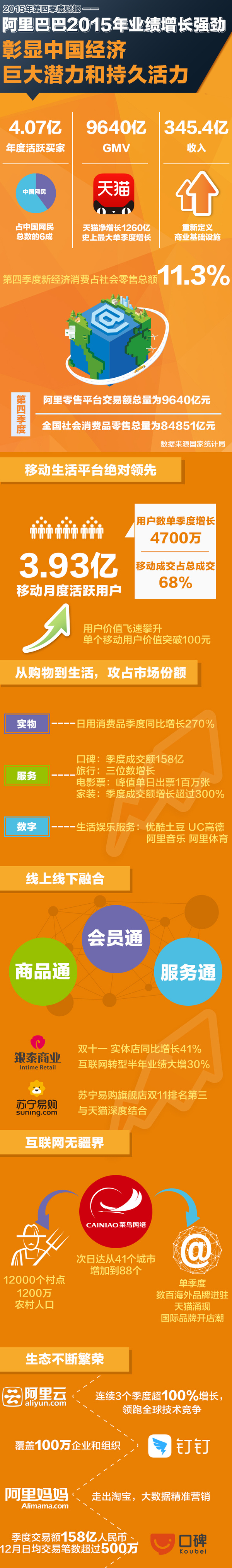 在2015年宏觀環境下,阿裏不僅助力中國消費和服務業增長的長期趨勢,更依靠科技驅動,把消費和服務業落地為實體經濟增長,在雲計算服務、企業級應用、數字營銷、物流網絡、線上線下融合上取得了令人矚目的成績。