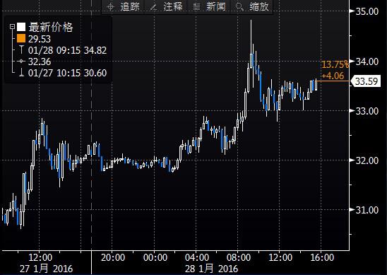 美國NYMEX WTI原油3月期貨周四(1月28日) 收漲0.92美元,漲幅2.85%,報33.22美元/桶。今日亞盤時段油價在一個約20美分的區間內超窄幅震蕩。但歐盤起,油價自31.74美元/桶的低位開始震蕩上行。有傳言說歐佩克和俄羅斯準備商討減產事宜,油價聞訊拔地而起逾2.7美元,刷新至月初以來最高水平34.82美元/桶。不過在收盤前,油價回落約2美元左右,最終報33.22美元/桶,漲幅2.85%,但日內振幅高達9.7%。