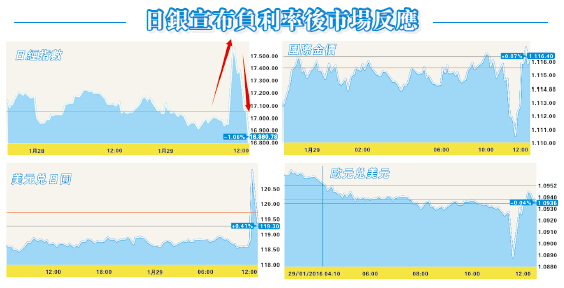 日本央行上午宣布「負利率」后,日圓一度暴跌2%,連續跌破119、120和121三個整數關口,但隨后又反彈至119.30。日股一度呈現冲高回落格局,不過日經指數最終收市升476.85點,升幅達2.8%。日本10年期國債利率則跌至歷史新低0.09%。其他亞太股市都全線收高,韓國KOSPI指數收市升5.12點,升幅0.27%,報1912.06點。澳洲標普ASX200指數收市升29.34點,升幅0.59%,報5005.5點。