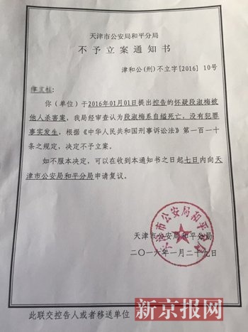 今日上午,天津市公安局和平分局向家屬送達不予立案通知書,稱家屬控告的“懷疑段淑梅被他人殺害案”,警方經審查認為段淑梅系自縊死亡,沒有犯罪事實發生,不予立案。