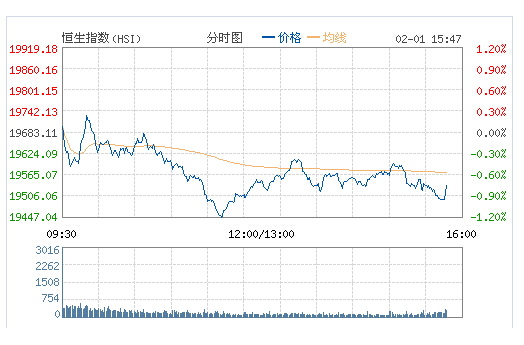 上周五美股三大指數收市大漲,日本股市今早亦向好。不過,內地官方今早公布1月中國制造業采購經理指數(PMI)為49.4,差過預期,且為三年多新低,拖累大市氣氛。恒生指數今早高開0.45%,開盤后一度升穿20天線(約19642點),其后反覆上落,上午11時后港股越走越弱,最多跌逾200點,低見19444點,之后跌幅收窄。截至收盤,恒生指數報19595.5點,跌87.61點,跌0.45%;國企指數報8144.85點,跌96.51點,跌1.17%;紅籌指數報3462.68點,跌9.67點,跌0.28%。大市成交額695億億港元。