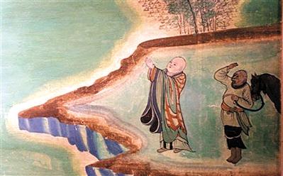 与《西游记》不同的是,壁画中只有唐僧和孙悟空。不是猪八戒忙着在高老庄娶媳妇没来,也不是沙和尚在流沙河当水怪忙旅游产业。而是那个时候,民间传说还没把他们“生”出来。