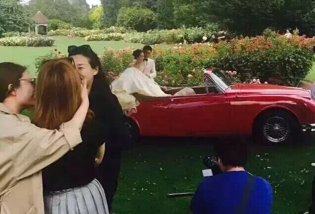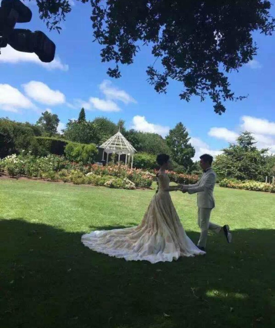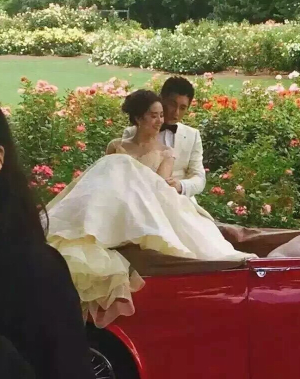 1日,有网友曝光两人现场照,吴奇隆身穿白色西服帅气十足,刘诗诗穿婚纱优雅迷人,两人在风景优美的花园拍摄,还在一辆红色的车上深情相拥。