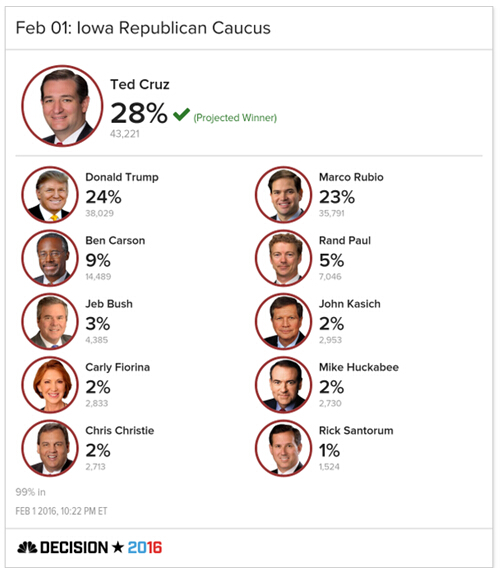 据NBC,克鲁兹(Ted Cruz)击败特朗普,赢得艾奥瓦州共和党党内初选。