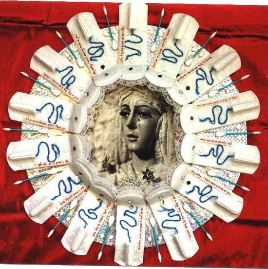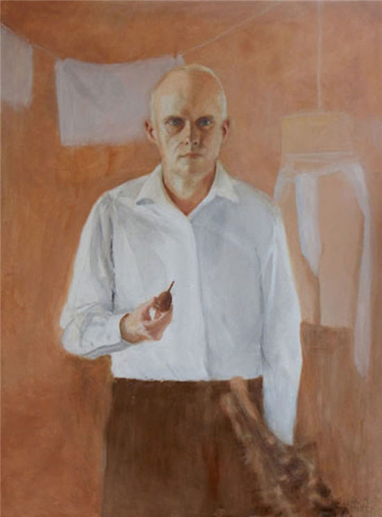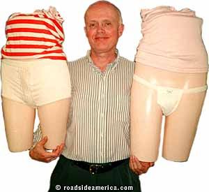 Harry运用了一种学术而严谨的方式来对待他的藏品。这有一些矛盾——有一些他的亲戚仍然感到不安。Harry说:95%的来访者都是“非常有智能的女性”,但她们仍然会勉强一位男士与她们一同前来,尽管那位男士会显得非常局促不安。 Harry的一个好朋友曾经开玩笑地问他把那些人体模型都藏在何处。如果Harry本人不是那么一本正经,我们也许会觉得在储藏室的墙内和高高的书架内可能会有猫腻。而他只是打开了客厅的冰箱——证明里面是空的。 Finley自画像,他右手拿着的是一个月经杯 如果说创建月经博物馆的想法多少有些无厘头,那么,Harry的一个严肃的想法是在华盛顿开设一家女性健康博物馆。这件博物馆不要门票,同时配有画廊、咖啡厅和礼品店。而他的这家博物馆的董事会包括:一流的女性卫生产品专家、航天卫生用品的合作设计师。同时,他所有的猫也能在博物馆里有固定的座位。 在与我们交谈期间,博物馆里的人物模型一直在缓缓转动。Harry一直在想这些模型究竟是穿衣服还是全裸会显得更加性感。 “这个模型的售价是35美元一片,我没有得到腿部和剩余部分是因为钱不够了。”有一些女性观看这些东西时会感到受到了冒犯。 Harry许不是恋物癖,但他的一些匿名捐赠者却是不折不扣的恋物癖。他说:一位来自中西部的捐赠者有一天打来电话,说想要捐赠一些来自其女友的内衣。在与该女友恋爱时,这位捐赠人保存了一些女友的内衣,但自从与妻子结婚后,前女友的内衣就一直呆在他的柜子里。在读完博物馆的相关讯息后,他捐赠了好几箱前女友的物品。 几年前,这个博物馆收到了媒体的关注,在参加了几次脱口秀后,Harry决定关掉博物馆,只保留一个非赢利性质的网站。当然,他还保留了几件有收藏价值的产品。其中最值得称道的是一条粉色的带有月经杯的裙子。这条裙子是一家公司在退出相关产业前捐献给他的。从来没有人穿过这条裙子,当然Harry也不会在镜头前穿给我们看,而我们却莫名感到一阵轻松。 “我开博物馆的原因是当时我在政府工作,这份工作有点无聊,因此,我决定把人类学、社会学、历史学和艺术结合起来,开一间博物馆。”Harry解释说。 而1999年关闭博物馆的部分原因是考虑到公共安全因素,Harry很高兴在博物馆开设的这几年里,没有人因为受伤或其它安全问题而起诉他。另外,Harry还将继续在政府部门工作,这意味着博物馆无法在工作日定期开放。