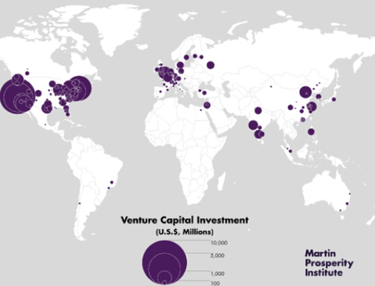 上周,Richard Florida發布了全球風險投資分布數據。這份數據主要是基于2012年全球的風投狀況,可能有些過時了,但我想他在大方向上還是正確的。