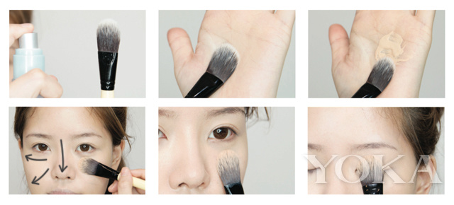 一、化妆刷 1.在刷子上喷上适量的保湿喷雾; 2.把刷子按在手心上使喷雾浸透刷头; 3.将粉底置于手背,再用粉底刷蘸取少许在脸部推开; 4.在脸部按照由内而外的顺序涂抹开来。在鼻翼等细微部位要把刷子立起来使用; 5.使用刷子时,如果脸上有明显的“刷痕”,可以用刷子轻轻地拍打来让粉底均匀平整起来。