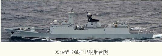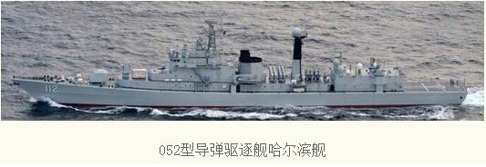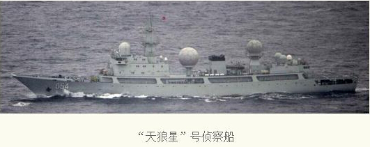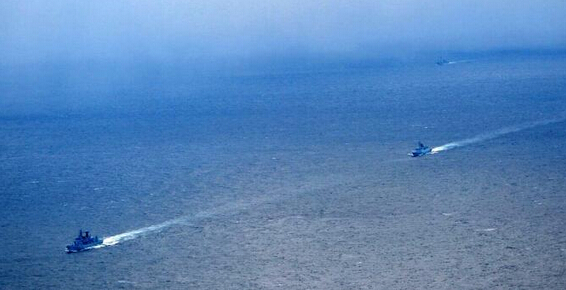 中國海軍編隊全景航行照片。從左至右:哈爾濱艦、煙臺艦、“天狼星”號偵察船