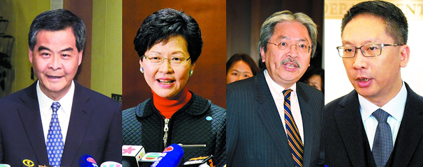 從左至右依次是:梁振英、林鄭月娥、曾俊華、袁國強