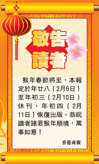 猴年春节将至,香港商报定于农历十二月二十八(2月6日)到正月初三(2月10日)休刊,正月初四(2月11日)恢复出版。