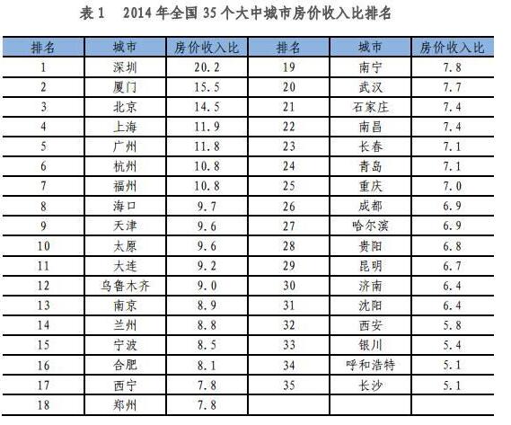 在2014年全国35个大中城市房价收入比排名中,深圳的房价收入比超过了20,位居第一位。也就是说在深圳,一个达到该市平均收入水平的家庭,如果购买一套100平方米的普通商品住房,要耗费20多年才能得偿所愿。全国平均要花费8.7年。