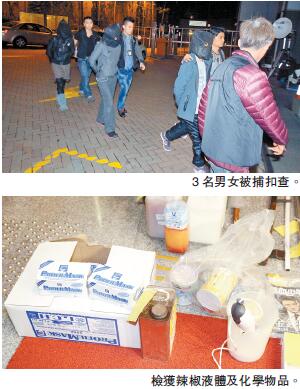 被捕男子34歲,任建築繪圖員,兩名女子分別46歲及47歲,報稱無業及售貨員,3人涉嫌「管有攻擊性武器作非法用途」,現仍被扣查,至於3人在初一晚是否有到旺角參加暴亂,仍有待調查。