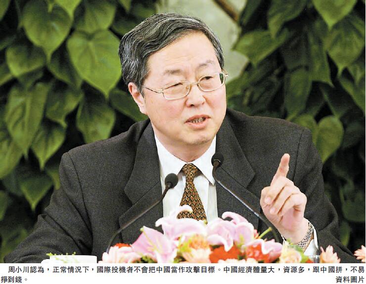 周小川認為,正常情況下,國際投機者不會把中國當作攻擊目標。中國經濟體量大,資源多,跟中國拼,不易掙到錢。事實上,中國過去許多年主要是資金流入,其中一部分可能是「熱錢」,會擇機撤出,沒什麼奇怪。