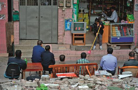 2015年11月28日,冼村也成為不少外來民工的落腳地,人們坐在一家小賣部前圍觀電視。
