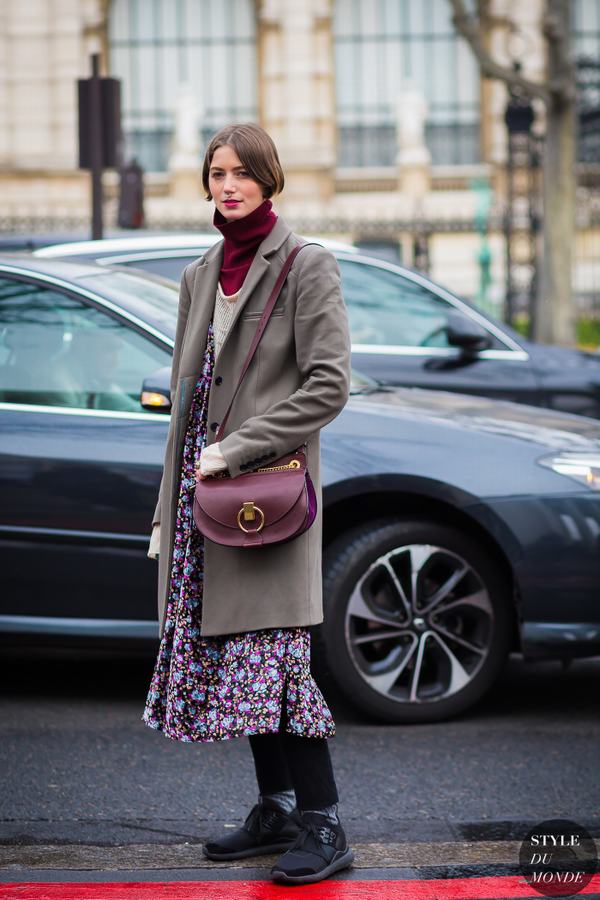 再进阶的穿搭就要费些脑细胞,比如连衣裙+高领针织,外搭长外套。