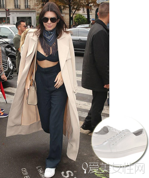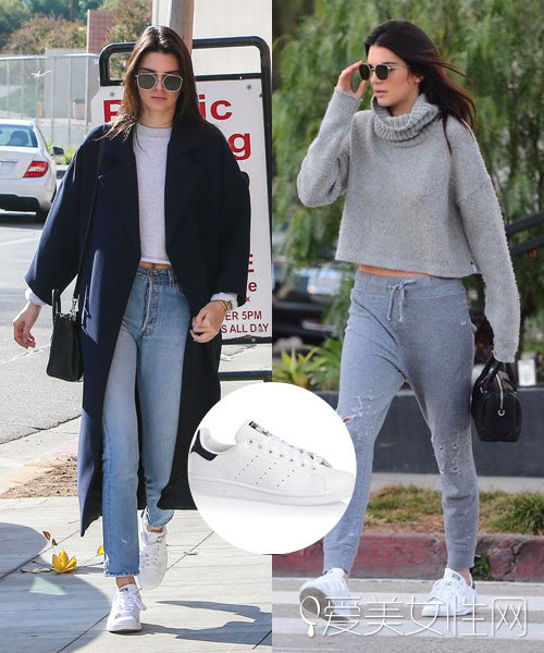 肯豆脚下的这双Adidas Stan Smith 系列可谓是2015年的大热鞋款,你敢说没见过它?搭配上大衣和牛仔裤舒适随性,潮流满分!