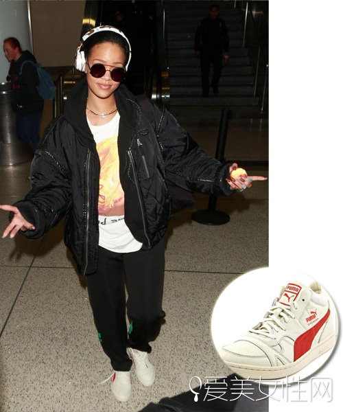 骨子里有着不安分细胞的蕾哈娜选择的鞋款当然也要与众不同的,Puma的高帮运动鞋配上夹克打造boyfriend运动风!