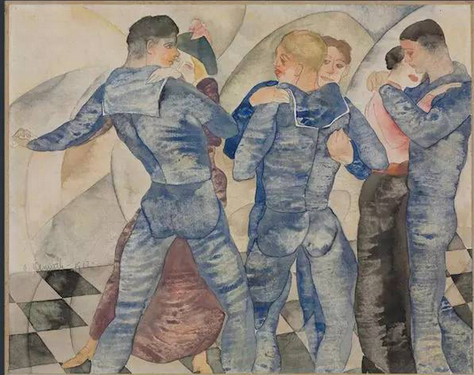 夏尔·德牧思的艺术作品分为两部分。作为和291画廊的签约画家,他画了大量高度现代主义的抽象作品。另一方面,作为一个男性同性恋,他也画了很多表现gay现实生活的作品,当然这些作品不是为了大规模流传而画的。在这幅作品中,德牧思表现了纽约港口一群水手要离开时的场景,这是艺术家最喜欢的主题之一。这些场景表现出海军舰队与世隔绝的环境下的男性关系,以及社会性别的“扭曲”。