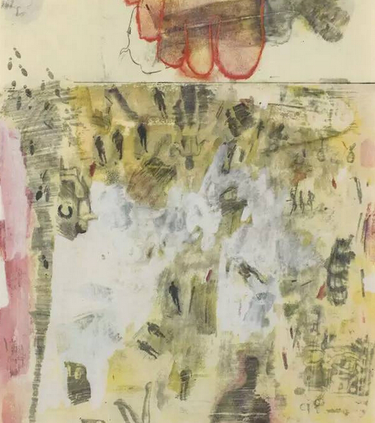 1950年代早期,抽象表现主义大行其道,罗伯特·劳森伯格以他著名的“空白”与其对峙,他最著名的作品就是将威廉·德·库宁的一幅画擦掉。这一行为也让劳森伯格意识到,沉默是对政治和社会压制的一种反抗。在1950年代末期,另一种反抗的策略开始显现,劳森伯格在他的但丁《神曲》系列绘画中有所呈现。这幅作品表达的是地狱的轮回,索多玛人被强迫在灼热的沙地上不停奔跑。艺术家将自己的脚的形状也置于画面上方,将他后来的恋人贾斯帕·琼斯放在画中左侧,代表琼斯的是他最著名的作品美国国旗。