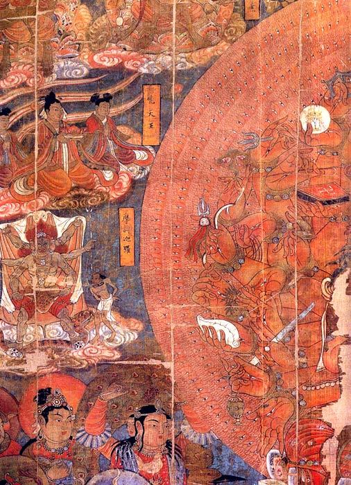 在敦煌藏经洞曾出土过一幅唐中期的千手观音帛画,其中有摩诃迦罗天(大黑天)在画面左侧。