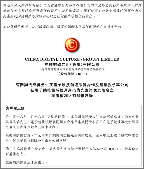 港股上市公司中国数码文化发布公告,拟与歌星周杰伦共同成立一家电子竞技战队公司,双方已签署合作备忘录。备忘录显示,中国数码文化被授予在电子竞技领域使用周杰伦肖像及姓名的独家权利,将与周杰伦在电子竞技领域展开为期6年的独家合作。倘正式协议获签立及完成,周杰伦可能透过授予人为该公司1000万股股份之实益拥有人。
