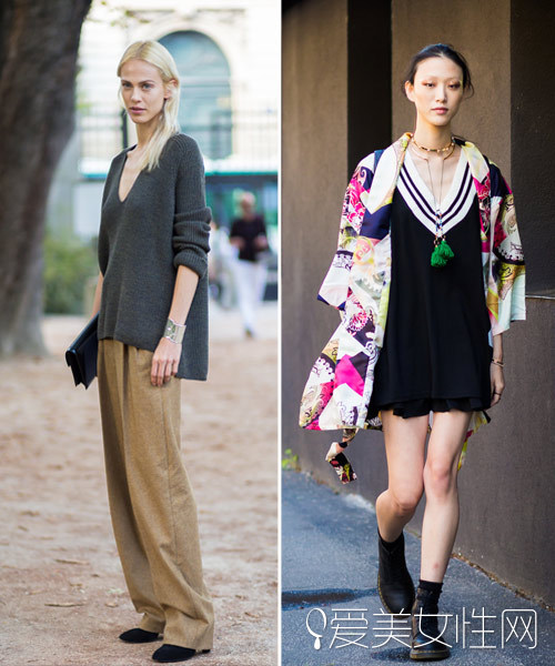 下身选宽松款是每个人都知道哒,那叠穿其实也能瘦腿你知道吗?这个方法实际上就是转移你的视线,让你只看到上身的精彩,而忽略的下身的···“小粗腿”!但叠穿也是需要技巧的,首先叠穿色彩的运用,不要把完全不搭的两种颜色的搭起来,搭得好就说是撞色,搭不好随时变成四不像,初学者要小心哦!其次,就是即使是叠穿也不要叠得太繁琐啦! Left:蝴蝶领的彩色丝绸衬衫加上短款白色毛衣的叠穿非常的小清新,短款的毛衣又更好地拉升了腰线,赞哦! Right:高领毛衣是最简单的叠穿单品,你就把它当一件普通的内搭来穿就好了,只不过高领的部分搭上其他衣服就自然而然地又叠穿的效果咯!金色的套装和棕色的皮草大衣相近色系营造层层递进却不复杂的效果。