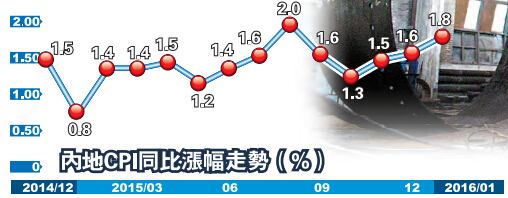 国家统计局昨日公布内地系列1月份经济数据。其中,居民消费价格(CPI)同比上涨1.8%,创下五个月以来新高,纾缓了通缩压力;工业生产者出厂价格(PPI)跌幅收窄,显示内地工业去库存略显成效。从市场反应来说,昨日香港恒指大幅反弹,国企指数跑赢大市,内地股市亦在大部分时间走强,说明市场对这一消息的反应属正面。应该说,内地开年的经济数据显示出了经济寒冬中的一丝「暖色」。