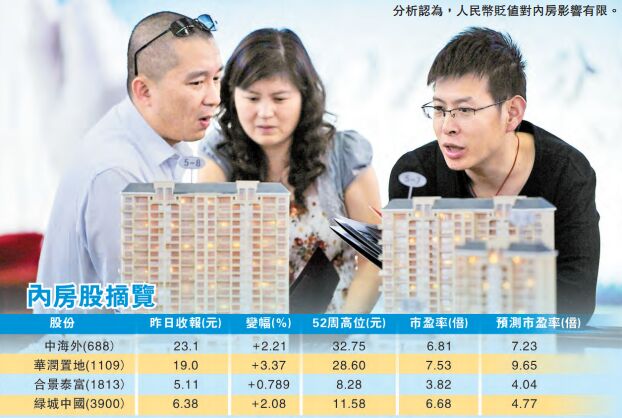 對此,交銀國際研究部助理副總裁謝騏聰表示,交銀推算,人民幣每貶值1%,對內房資產净值影響只有1.5%至2%,所以自去年8月起,人民幣貶值總幅度對內房的價值最多只有10%。所以,對投資者而言,人民幣貶值對於內房的影響不足為懼。