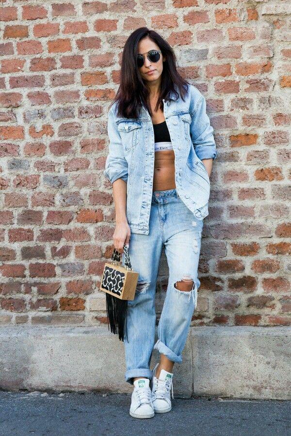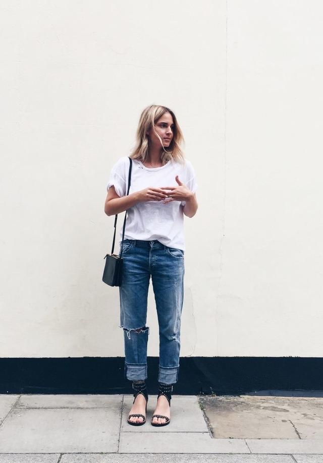 Boyfriend Jeans 宽松随性,但也多为低腰款,虽然能遮肉,但是裤腿肥大。如果你自认不是比例好的长腿星人,就乖乖把衣服塞进裤子里去吧,这个法则适用于衬衫、短袖 T、高领毛衣。不仅是显腿长的问题,整体 look 看起来也会更精神。